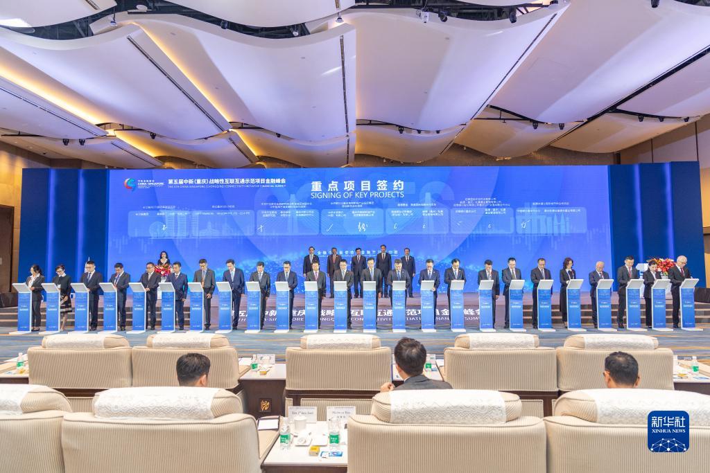 這是2023年4月20日在重慶市第五屆中新(重慶)戰略性互聯互通示範項目金融峰會開幕式現場拍攝的重點項目簽約儀式。