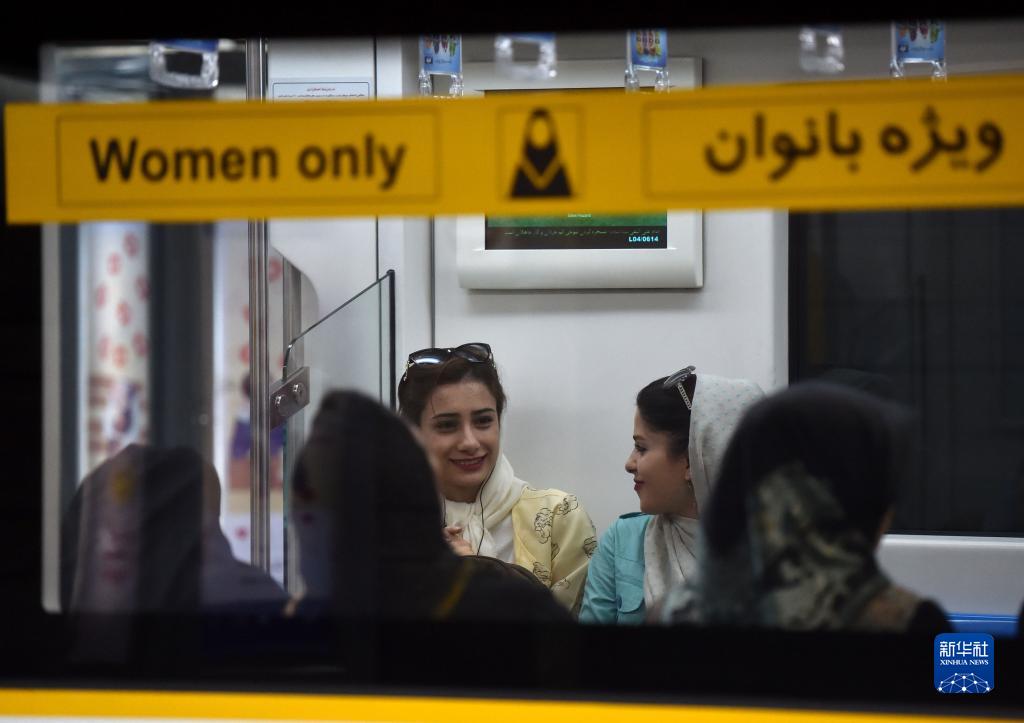 2016年9月4日,幾名女性乘客在伊朗德黑蘭乘坐地鐵。伊朗首都德黑蘭5條地鐵線全部由中國公司承建,其中德黑蘭地鐵1、2號線由中信國際承建,3、4、5號線由北方國際承建;地鐵車輛由中伊合資的德黑蘭軌道車輛製造公司(由中國的北方國際合作股份有限公司、中國中車長春軌道客車股份有限公司和伊朗綠菠蘿工業集團在伊朗合資成立)提供。