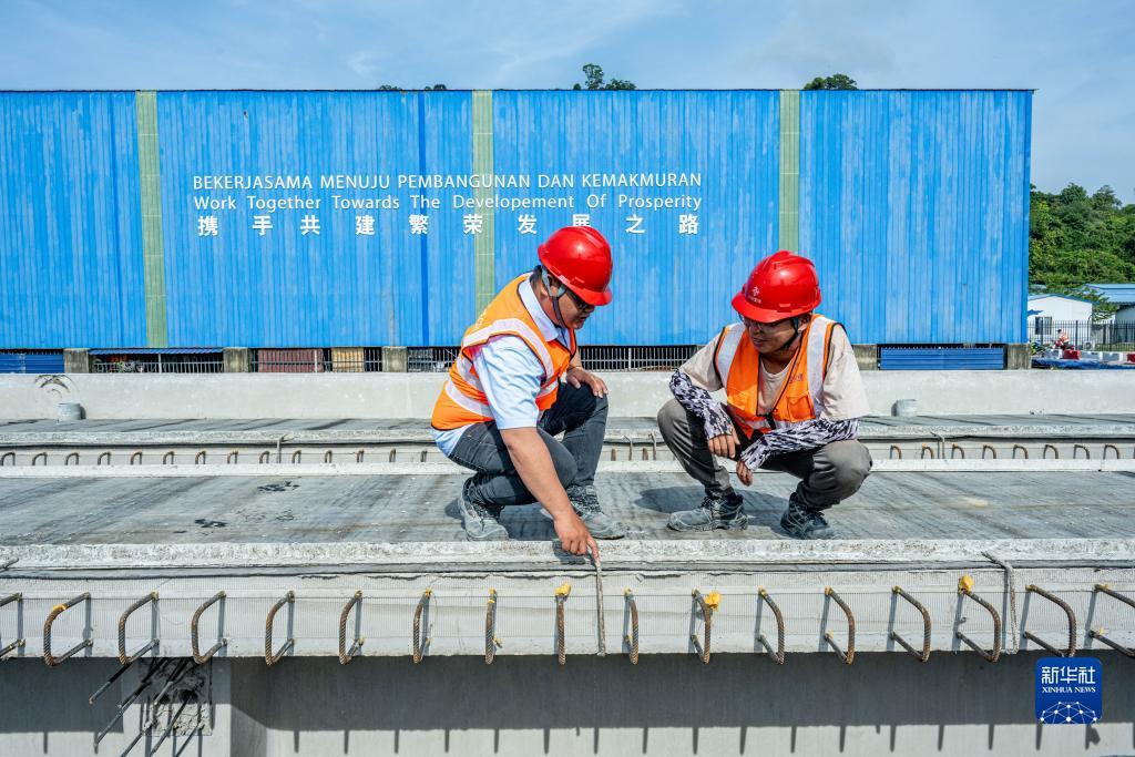 2023年4月26日,在馬來西亞吉蘭丹州的馬東鐵項目一分部制梁場,技術主管鄧友志(右)和馬來西亞本地青年員工鄧德緯討論生産情況。共建“一帶一路”倡議框架下的馬東鐵項目對促進當地經濟發展、基礎設施建設與聯通、增進民生福祉有着重要作用。