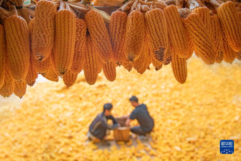 10月12日,雲南省文山壯族苗族自治州文山市追栗街鎮的農民晾曬收穫的玉米。