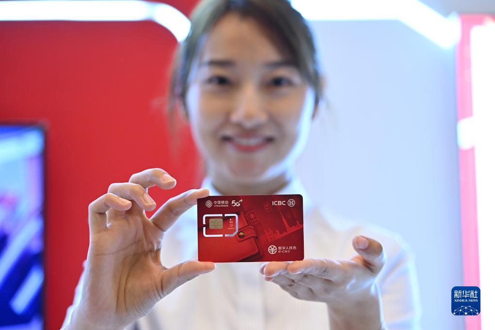 在論壇設置的數字人民幣體驗區,工商銀行展&的工作人員展示一款工商銀行與中國移動聯合研發的數字人民幣SIM卡硬錢包(10月12日攝)。該硬錢包支持無網無電支付。