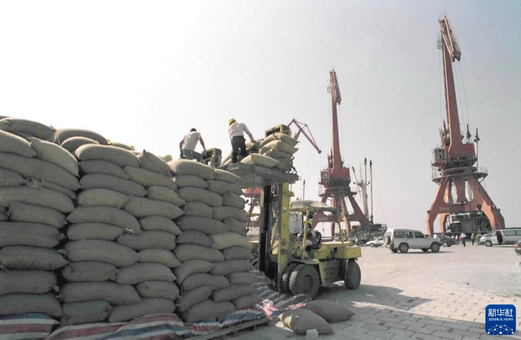 這是2004年4月9日在欽州港碼頭拍攝的出口物資裝運場景。