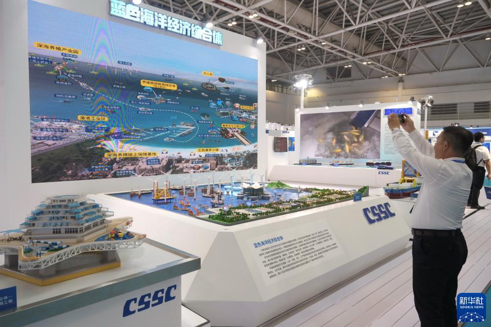 10月12日,參觀者在2023中國海洋裝備博覽會上的“藍色海洋經濟綜合體”沙盤前拍攝。