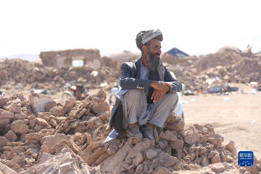 10月11日,在阿富汗西部赫拉特省津達詹區奈卜拉菲村,一名老人坐在震後廢墟上。