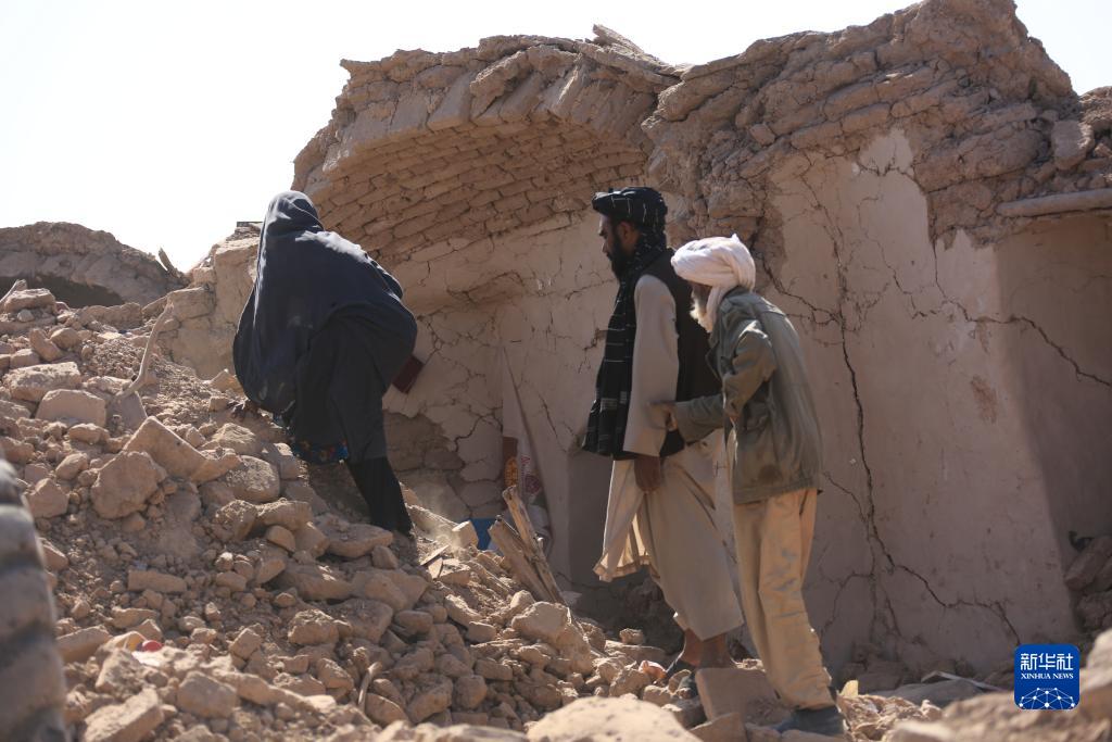 10月11日,在阿富汗西部赫拉特省津達詹區奈卜拉菲村,村民在廢墟上尋找遇難者遺體。