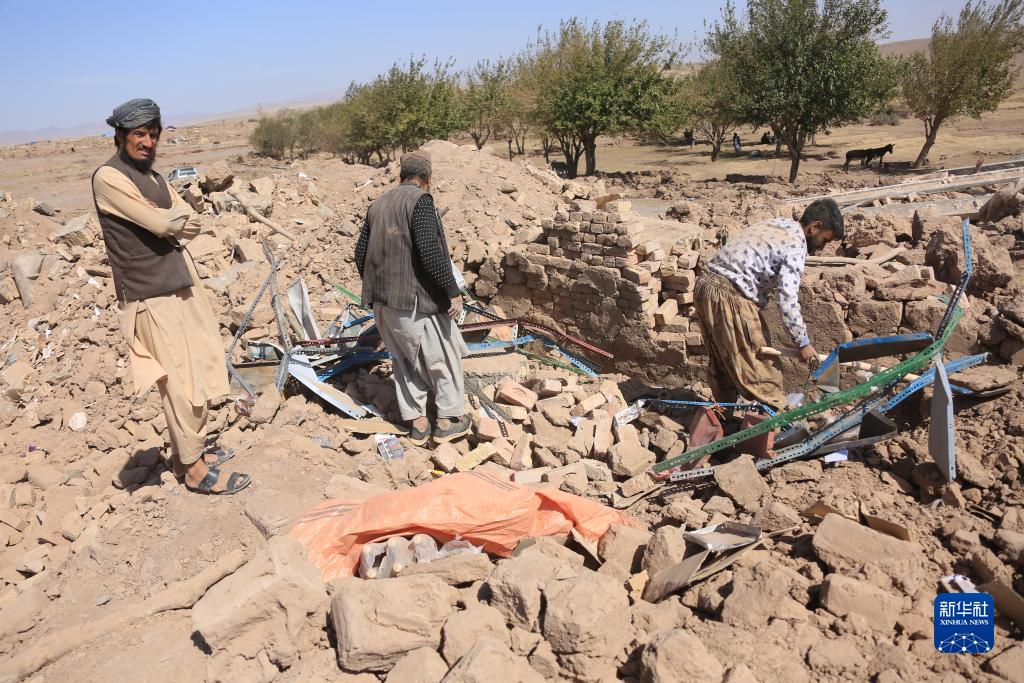 10月11日,在阿富汗西部赫拉特省津達詹區奈卜拉菲村,村民在廢墟上尋找遇難者遺體。