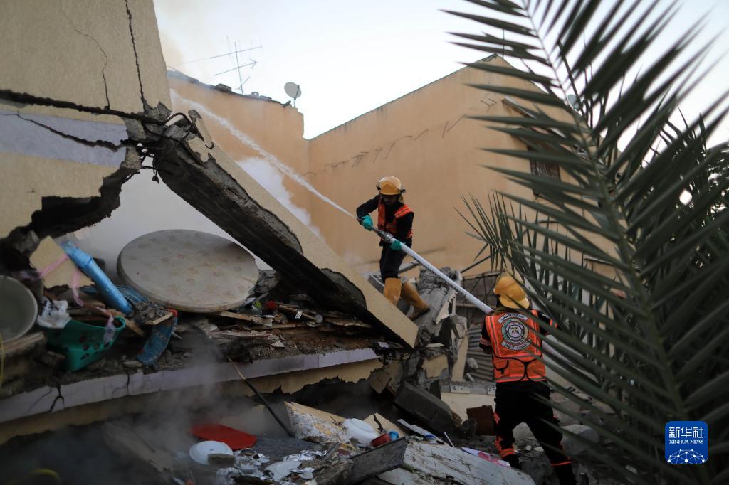 10月12日,在加沙地帶南部城市汗尤尼斯,巴勒斯坦民防人員給遭以色列空襲的建築滅火。