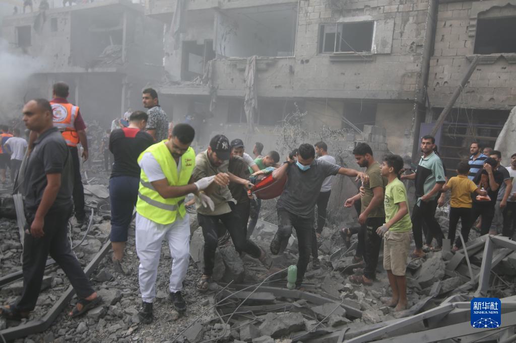 10月12日,在加沙地帶南部城市拉法,人們在遭以色列空襲的受損建築中救援傷者。