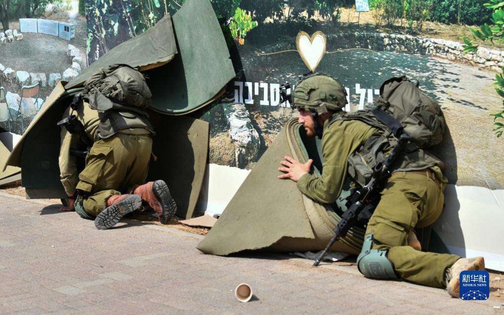 10月12日,以色列南部城市斯代羅特,以軍士兵聽到火箭彈襲擊警報後避險。