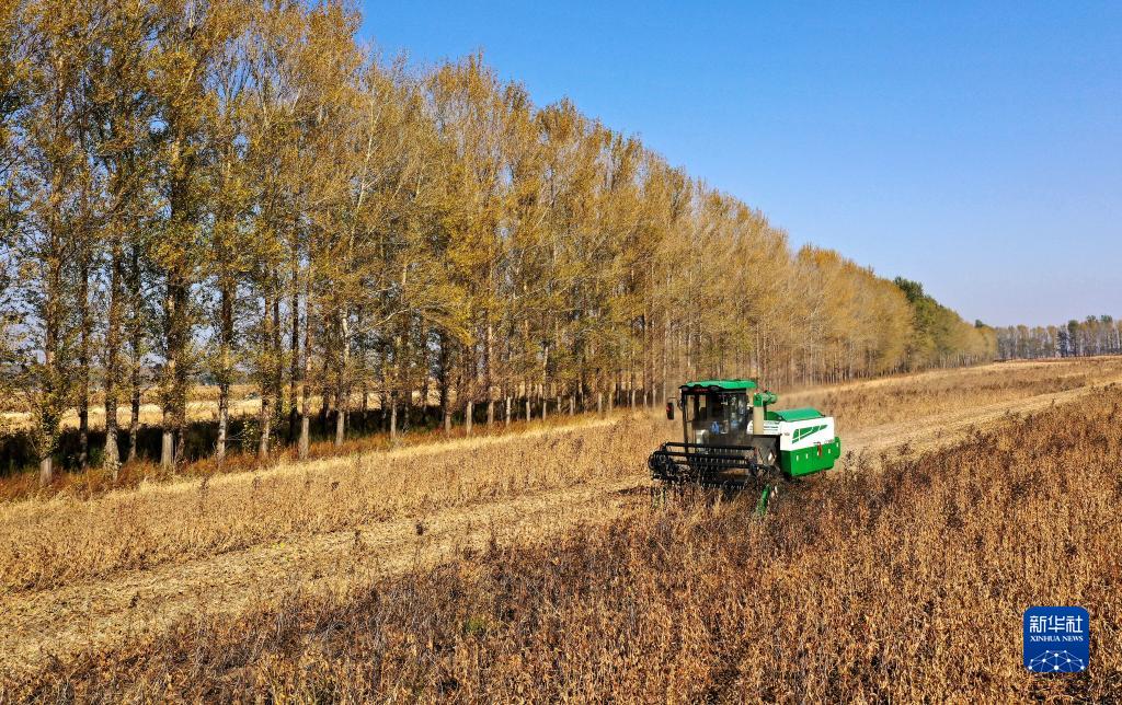 10月12日,收割機械在昌圖縣亮中橋鎮亮中村的大豆田裏作業(無人機照片)。