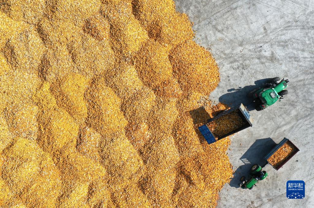 10月12日,裝運拖拉機在昌圖縣亮中橋鎮永豐村的糧場內卸下剛剛收穫的玉米(無人機照片)。