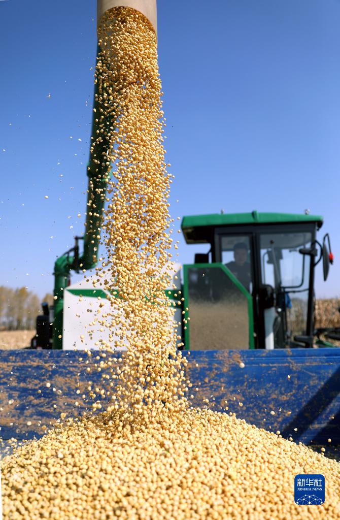 10月12日,農機在昌圖縣亮中橋鎮亮中村的大豆田裏裝運剛剛收穫的大豆。