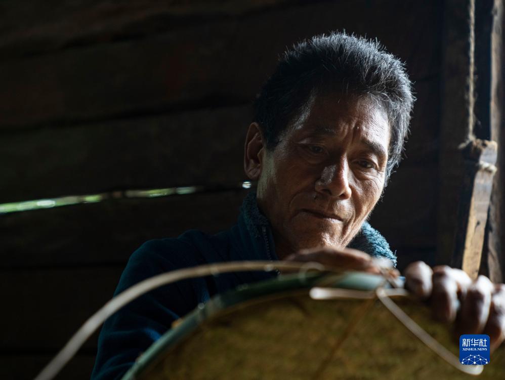 在西藏墨脫縣背崩鄉巴登村,一名村民在編織竹筐(10月11日攝)。