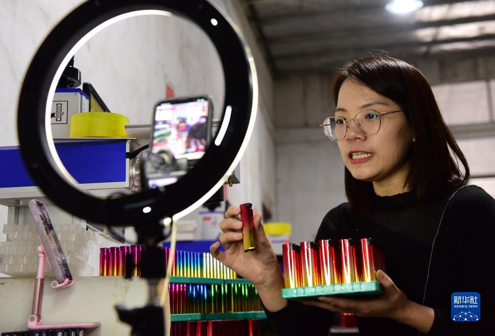 10月12日,河南省夏邑縣會亭鎮一家打火機企業的員工通過直播銷售打火機。