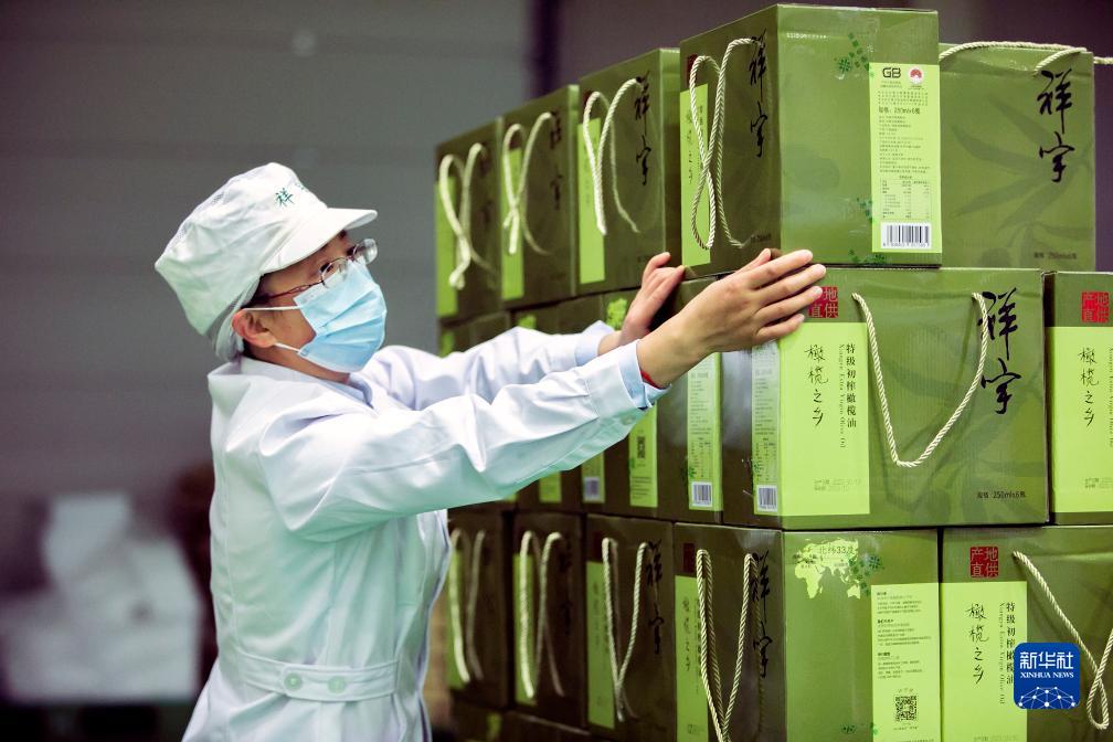 10月11日,在隴南市武都區一家油橄欖加工企業生産線上,工作人員將包裝好的橄欖油碼放整齊。