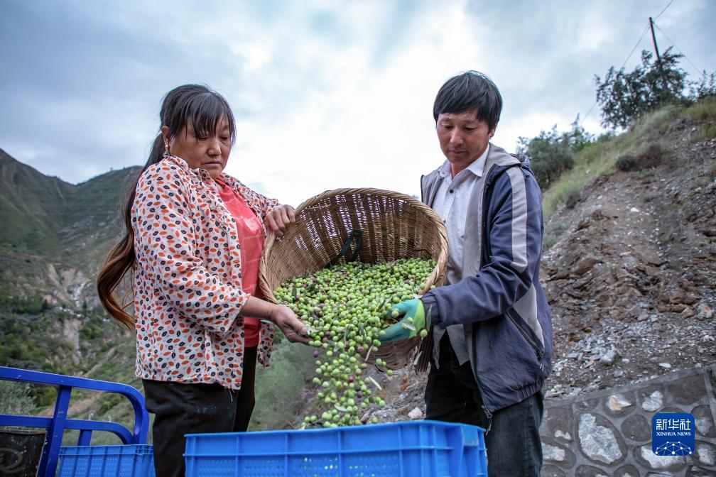 10月12日,在隴南市武都區外納鎮稻畦村一處油橄欖種植基地,農戶將採摘的油橄欖倒入收納箱。