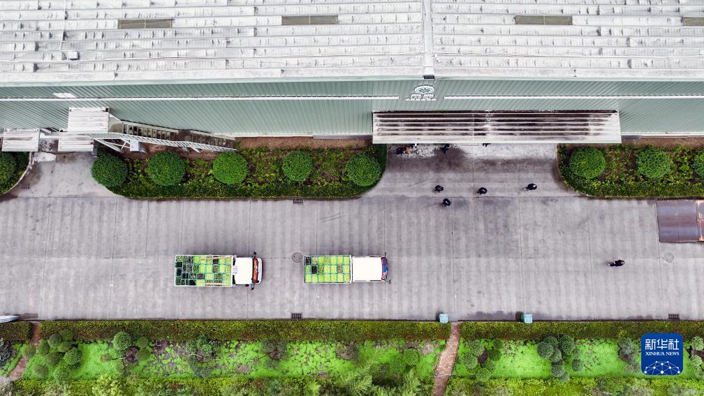 10月11日,滿載油橄欖的車輛駛入隴南市武都區一家油橄欖加工企業(無人機照片)。