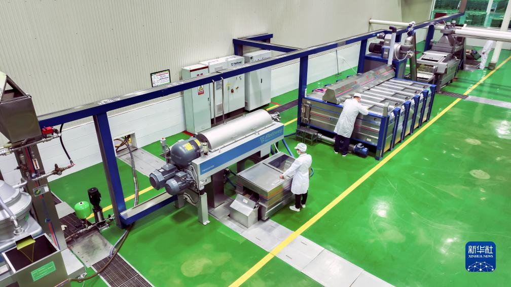 10月11日,隴南市武都區一家油橄欖加工企業的工人在生産線上進行榨油作業(無人機照片)。