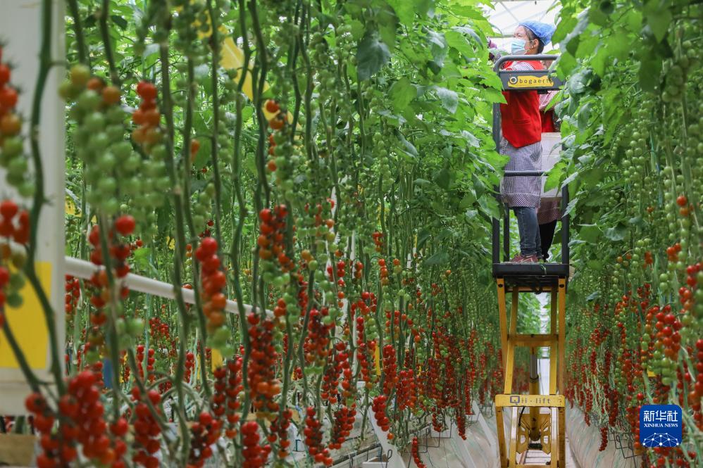 近日,在甘肅省平涼市崆峒區四十里鋪鎮的智能玻璃溫室裏,採用基質吊架立體栽培系統等技術培育的串收番茄陸續成熟,務工人員忙着收穫、打包,準備進行銷售。近年來,平涼市着力發展設施蔬菜産業鏈,不僅為市場提供了高品質産品,還幫助群眾實現就近就業。