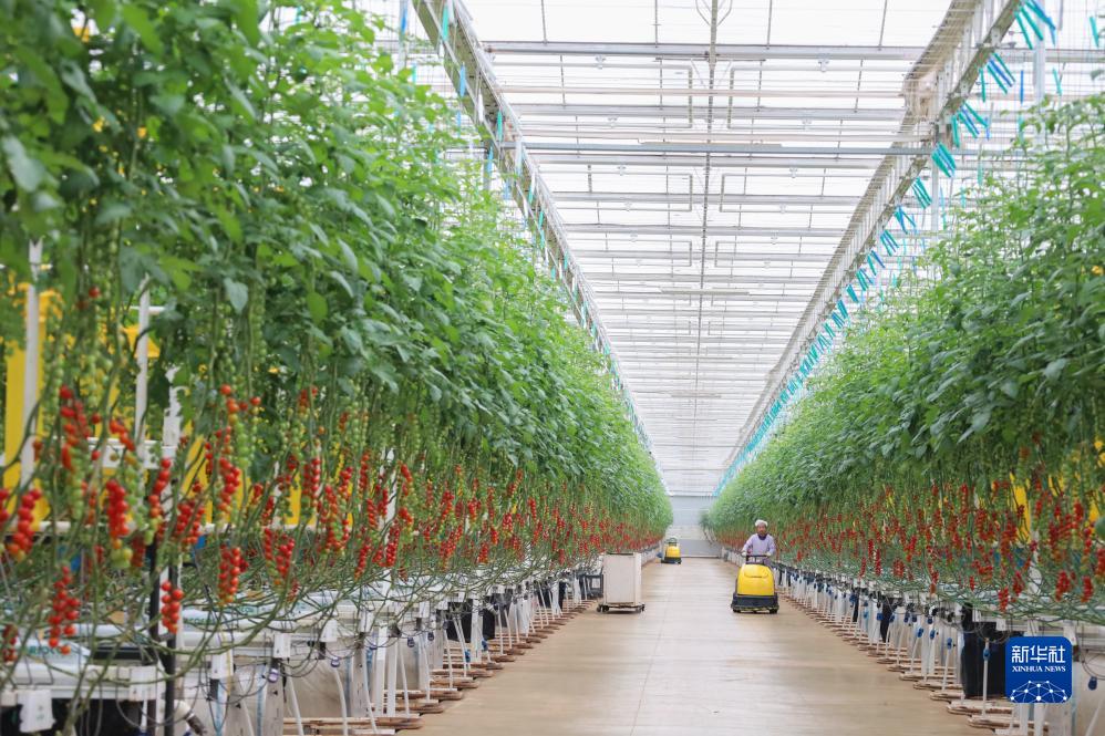 近日,在甘肅省平涼市崆峒區四十里鋪鎮的智能玻璃溫室裏,採用基質吊架立體栽培系統等技術培育的串收番茄陸續成熟,務工人員忙着收穫、打包,準備進行銷售。近年來,平涼市着力發展設施蔬菜産業鏈,不僅為市場提供了高品質産品,還幫助群眾實現就近就業。