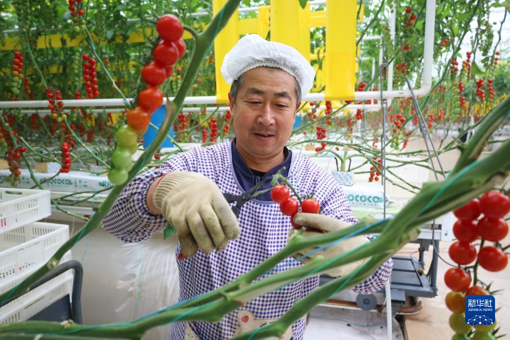 近日,在甘肅省平涼市崆峒區四十里鋪鎮的智能玻璃溫室裏,採用基質吊架立體栽培系統等技術培育的串收番茄陸續成熟,務工人員忙着收穫、打包,準備進行銷售。近年來,平涼市着力發展設施蔬菜産業鏈,不僅為市場提供了高品質産品,還幫助群眾實現就近就業。
