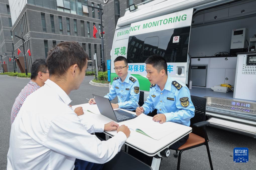 10月13日,在杭州市臨安區濱河産業園內,杭州市生態環境局臨安分局工作人員乘坐移動審批車上門為企業辦理排污許可登記。