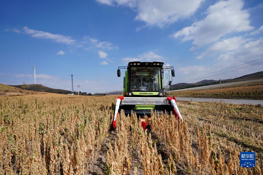 10月12日,收割機在河北省沽源縣白土窯鄉陳家營村田地裏收割藜麥。