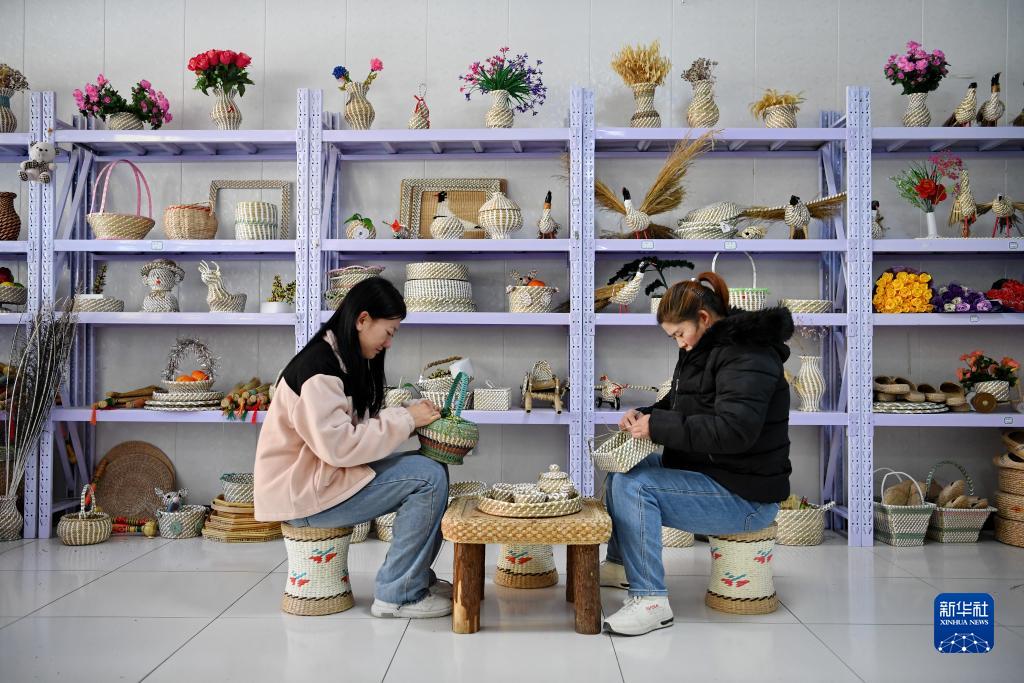 10月11日,河北省康保縣康保鎮一家手工編織企業的工人在編織工藝品。