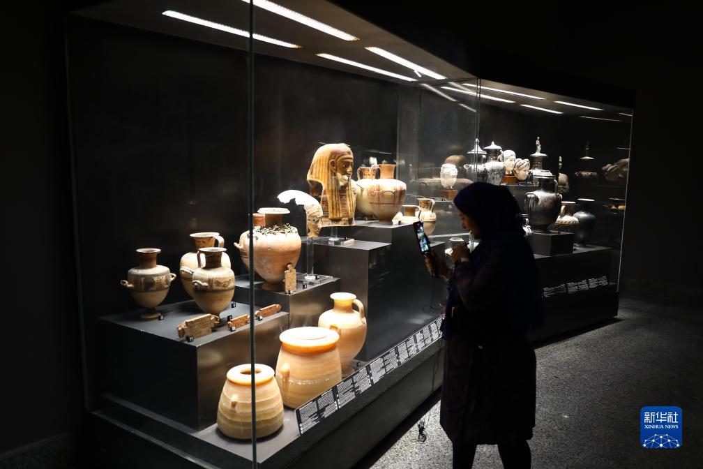10月12日,一名女子在埃及亞歷山大希臘羅馬博物館拍攝展出的文物。