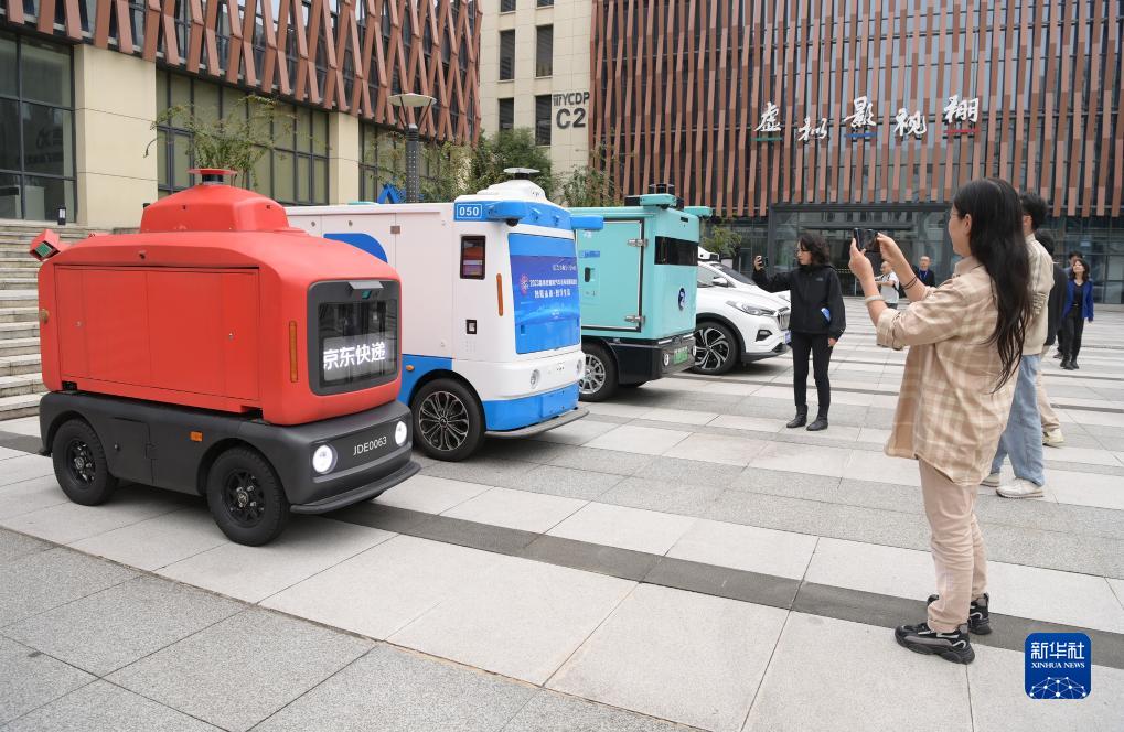 10月11日在重慶永川大數據産業園拍攝的對外展示的無人駕駛環衛車、無人配送車等智能車輛。