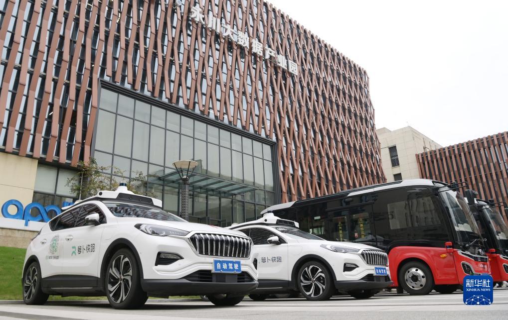 10月11日在重慶永川大數據産業園拍攝的對外展示的無人駕駛商業運營車等智能車輛。