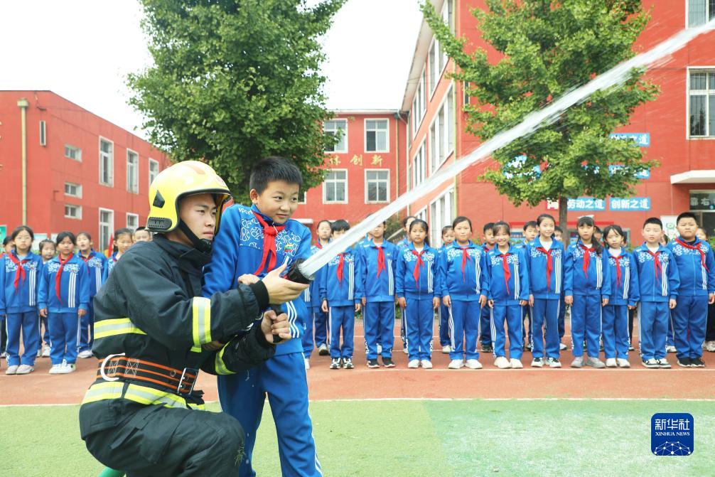 10月13日,河北省唐山市豐潤區平安路小學的學生在消防員的指導下體驗水槍。
