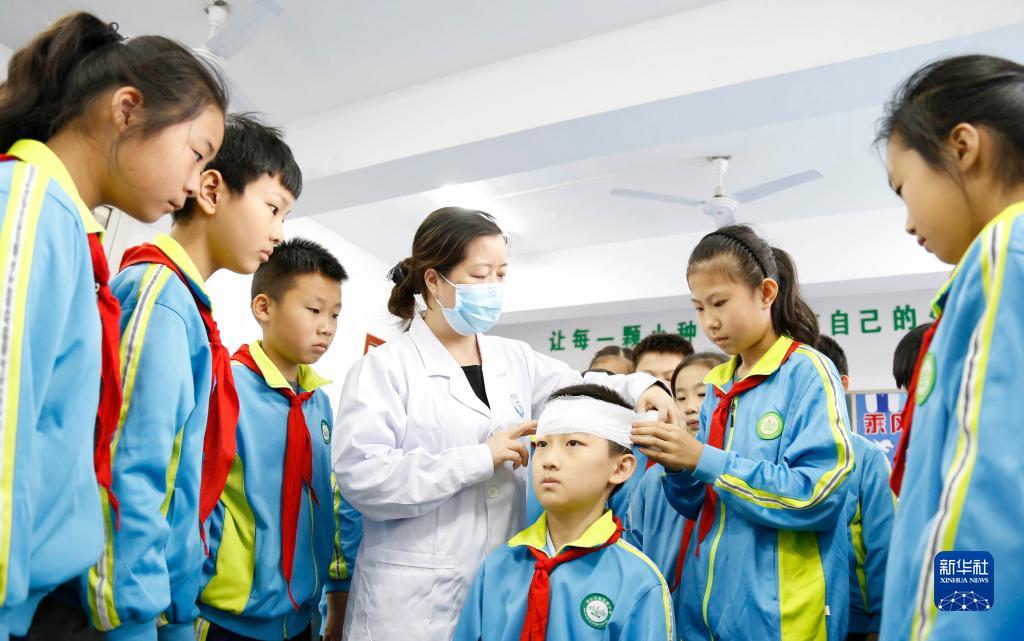 10月13日,在河北省邢&市家樂園小學,學生在醫護人員指導下學習緊急救護知識。