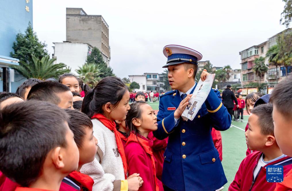 10月13日,消防員在貴州省黔西市第一小學向學生宣傳減災知識。