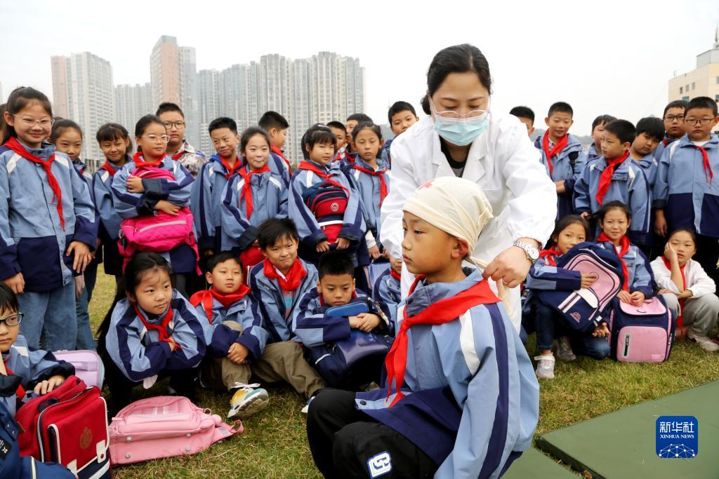 10月13日,在江蘇省連雲港市院前小學,醫護人員為學生講解急救常識。