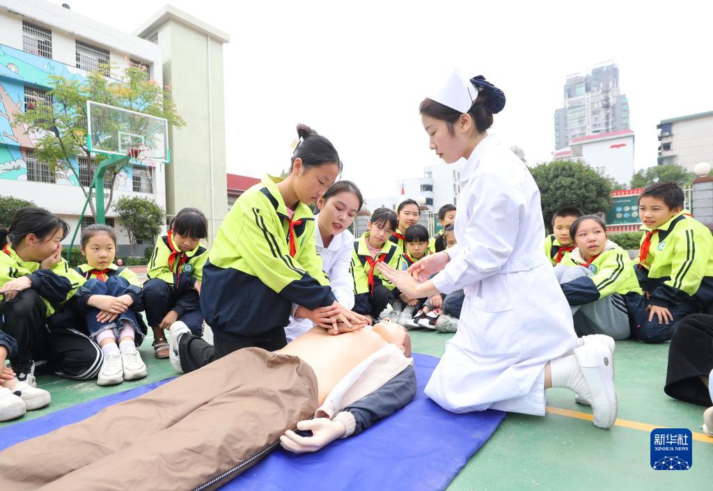 10月13日,在湖南省衡陽市蒸湘區實驗小學,南華大學護理學院的志願者指導小學生進行心肺復蘇急救操作。