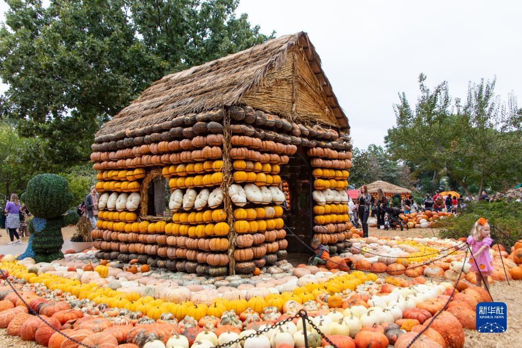 這是10月12日在美國得克薩斯州達拉斯植物園的“南瓜小鎮”裏拍攝的一個南瓜屋。