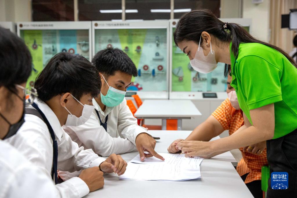 3月14日,在泰國大城府大城技術學院魯班工坊,教師(右一)給學生上課。