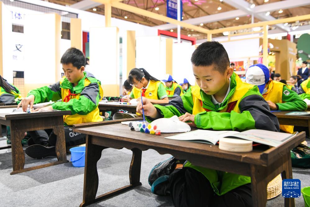 10月13日,在位於成都市世紀城新國際會展中心的2023天府書展主展場,參加研學活動的學生在體驗臉譜繪製。