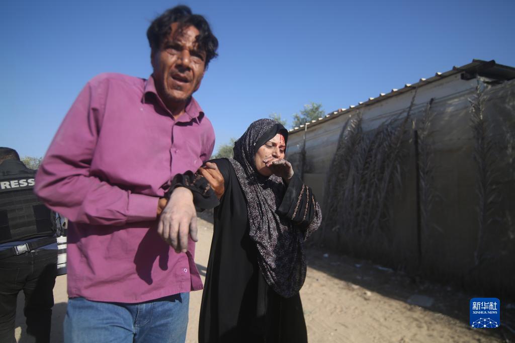 10月13日,在加沙地帶南部城市拉法,人們在遭以色列空襲的受損建築中救援傷者。