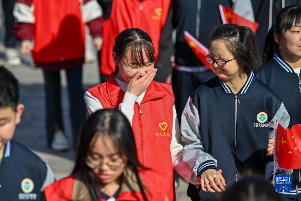 10月13日,志願者和盲校學生在太原汾河公園交流。