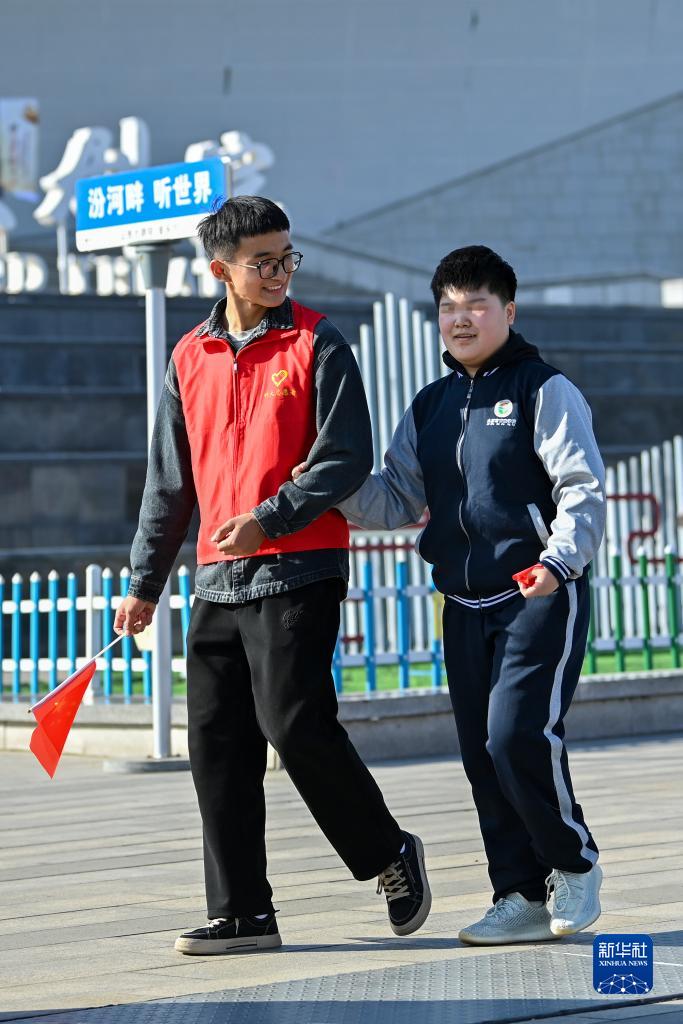 10月13日,志願者和盲校學生在太原汾河公園交流。