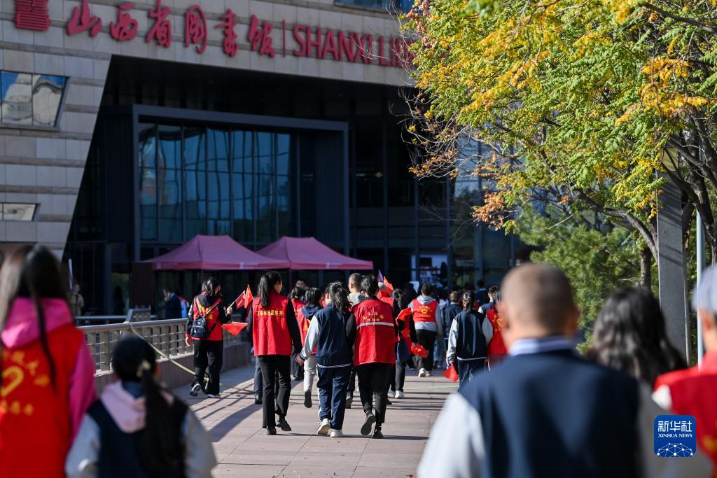 10月13日,志願者協助盲校學生在山西省圖書館外參觀。