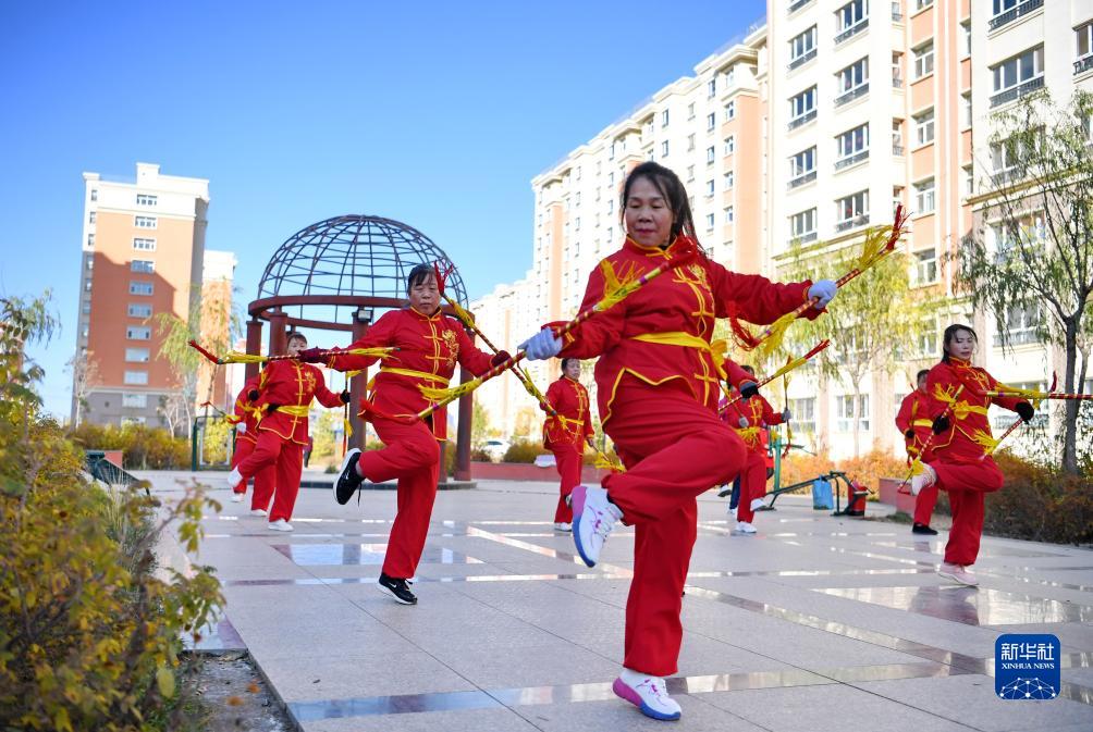 10月13日,河北省康保縣怡安康城社區居民在練習康保二人&霸王鞭。