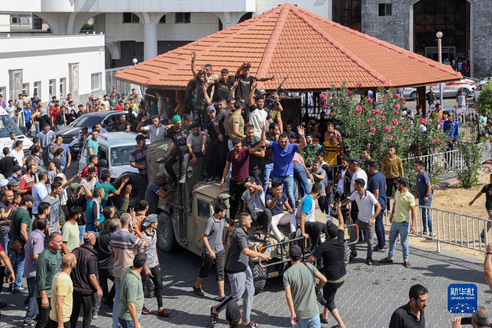10月7日,在加沙城,巴勒斯坦人登上一輛以色列軍用車輛。