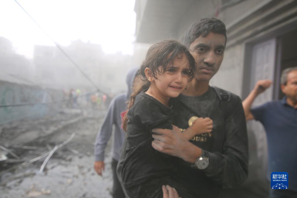 10月12日,在加沙地帶南部城市拉法,一名男子抱着小女孩走在遭以色列空襲的受損建築中。