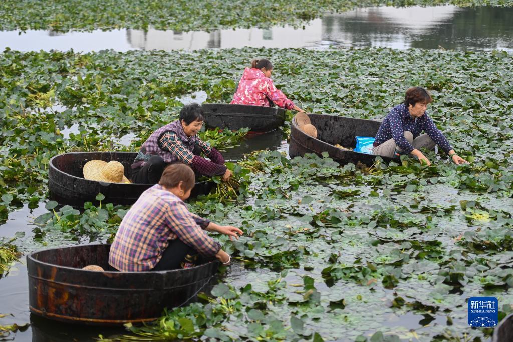 10月14日,在南潯區和孚鎮新荻村菱塘,村民劃着菱桶採摘菱角。