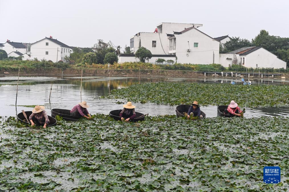 10月14日,在南潯區和孚鎮新荻村菱塘,村民劃着菱桶採摘菱角。