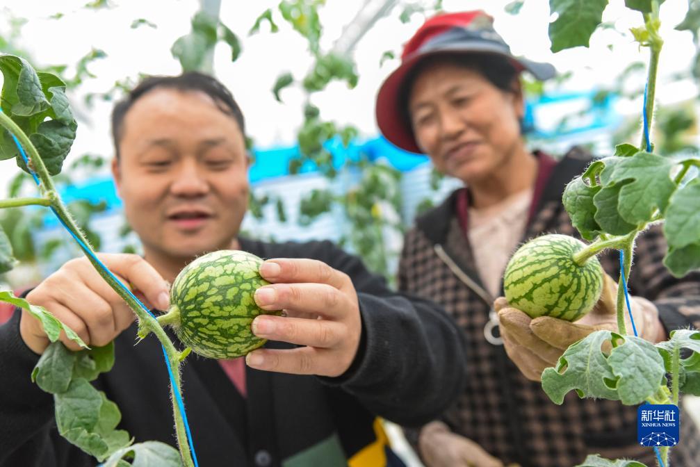 10月13日,在理塘縣瑪吉阿米花園農莊的智慧農業無土栽培館,農莊負責人丁義(左)向當地藏族群眾卓瑪擁忠講解玲瓏西瓜的管理技術和注意事項。