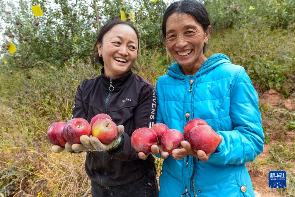 10月13日,在鄉城縣“蘋果+藏豬”種養循環現代農業園區內的有機蘋果種植示範基地,當地藏族群眾太(左)和藏格展示採摘的蘋果。